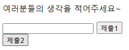 즉 제출1 버튼을 누르면 버튼의 용도인 "submit"을 input 요소와 함께 아주 잘 수행하고 있다고 볼 수 있다.